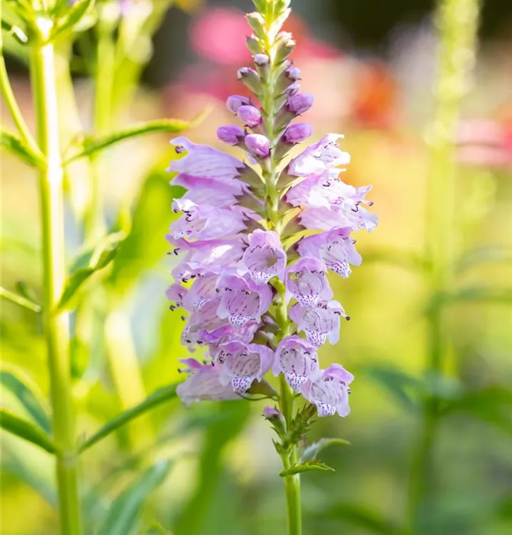Physostegia virginiana 'Rosea' bildet lippenförmige, in Ähren angeordnete, rosafarbene Blüten ab Juli.