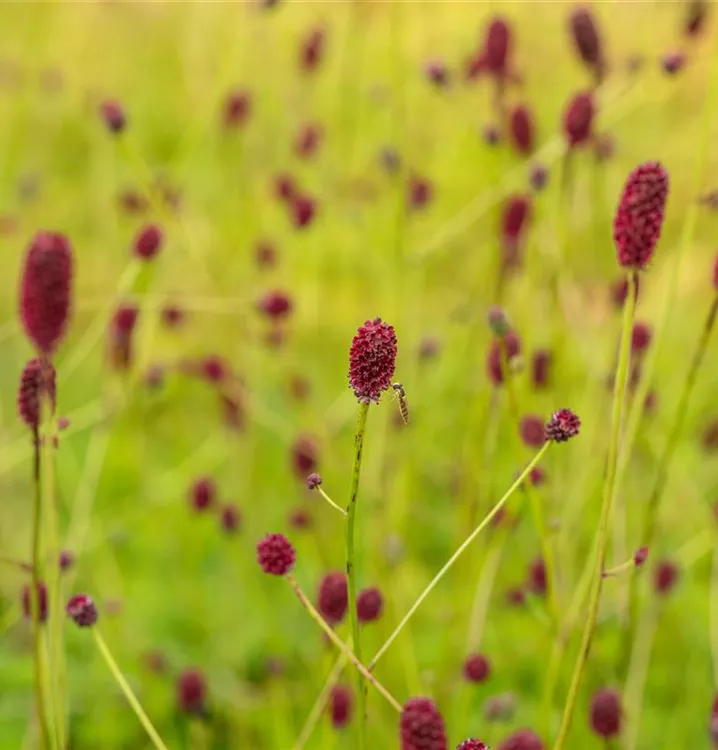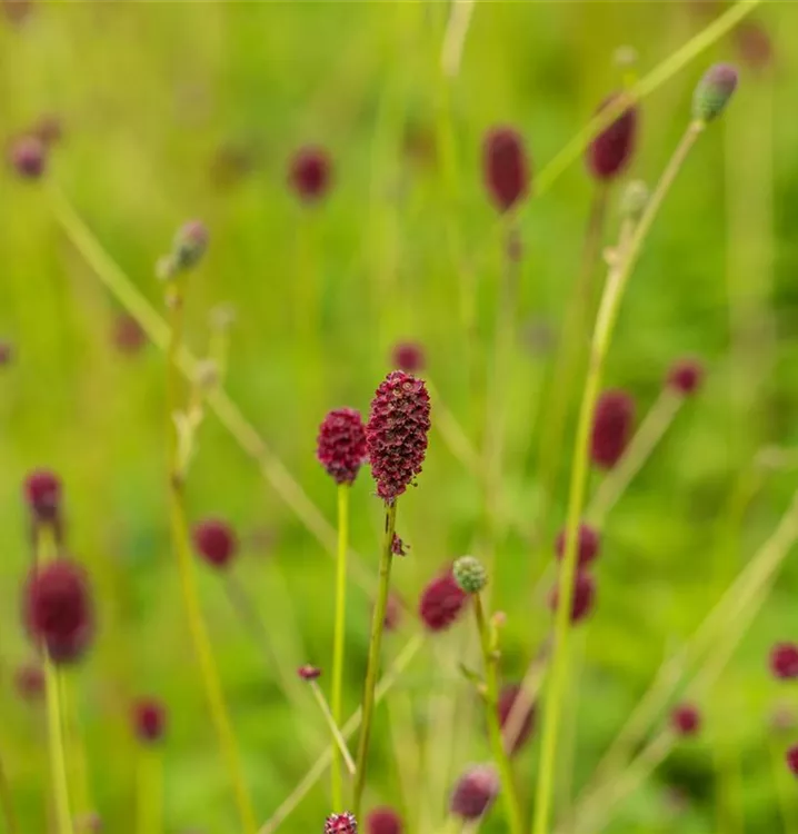 Der Garten-Wiesenknopf 'Tanna' (Sanguisorba officinalis) ist eine aufrechte Staude, die von Juni bis August dunkelrote, in Ähren angeordnete Blüten bildet. An einem sonnigen bis halbschattigen Standort mit durchlässigem, lockerem, nährstoffreichem Boden erreicht er gewöhnlich eine Höhe von ca. 1,1 m und wird ca. 50 cm breit. Der Garten-Wiesenknopf 'Tanna' ist gut frostverträglich.