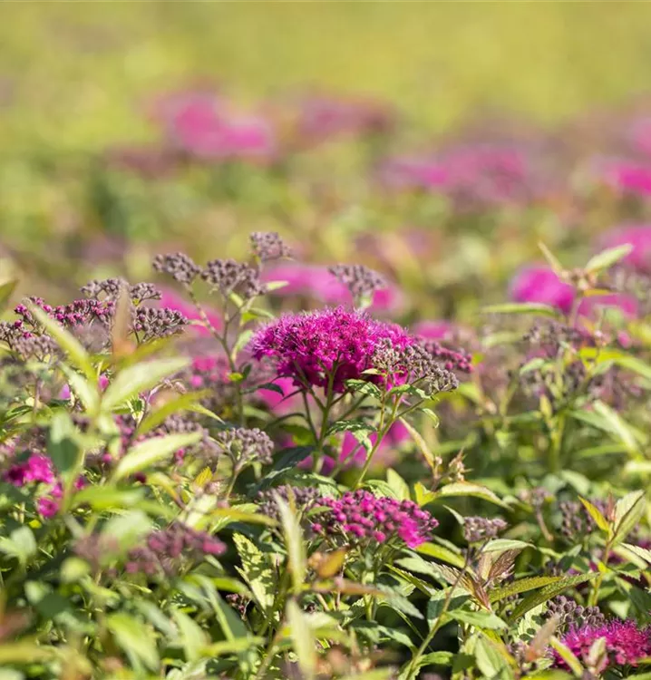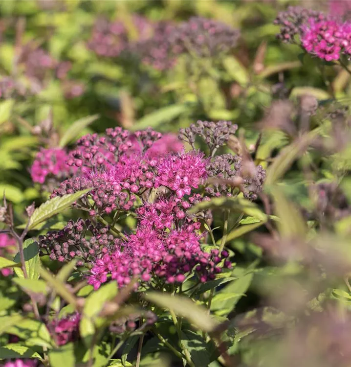 Die magentafarbenen Blüten der Sommerspiere 'Anthony Waterer' erscheinen in Trugdolden von Juli bis September. Diese werden etwa 15 - 20 cm groß.