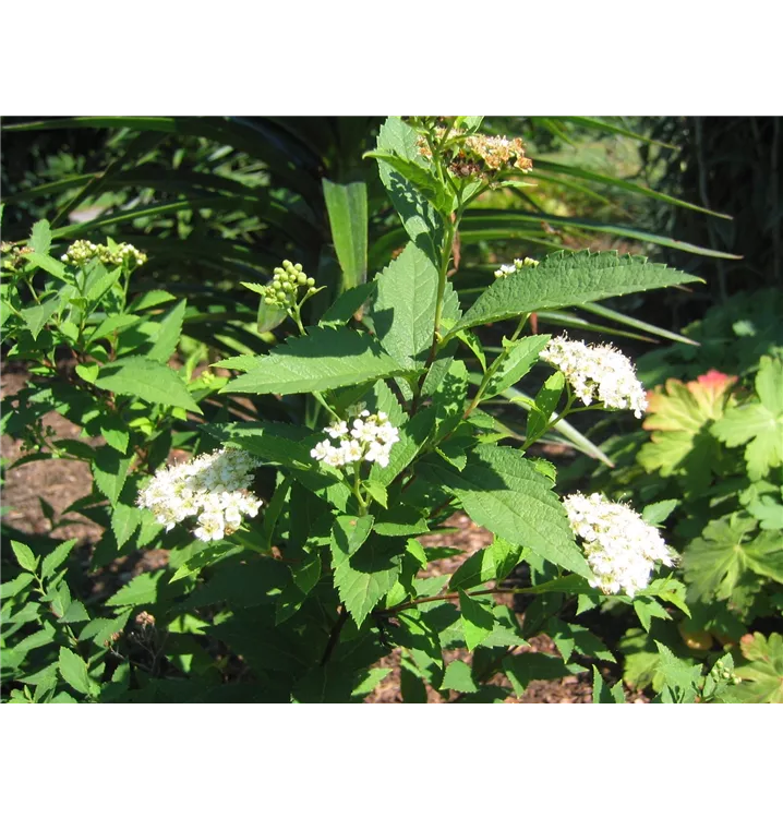 Die weißen Blüten der Sommerspiere 'Albiflora' erscheinen in Schirmtrauben von Juli bis September.