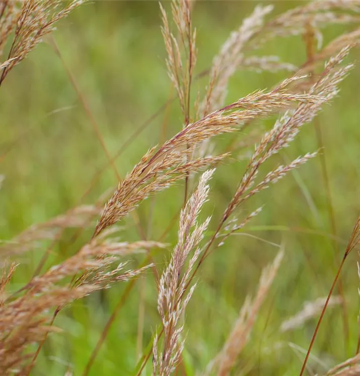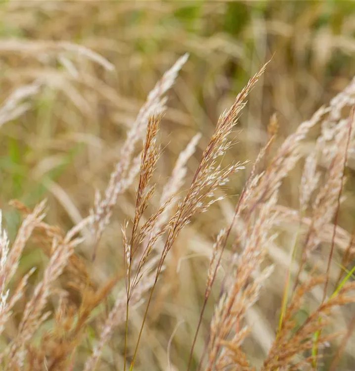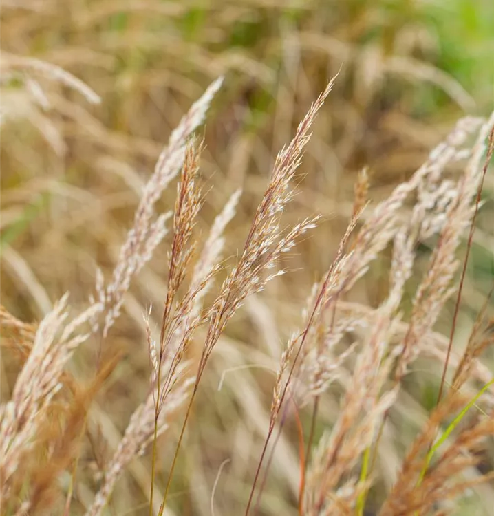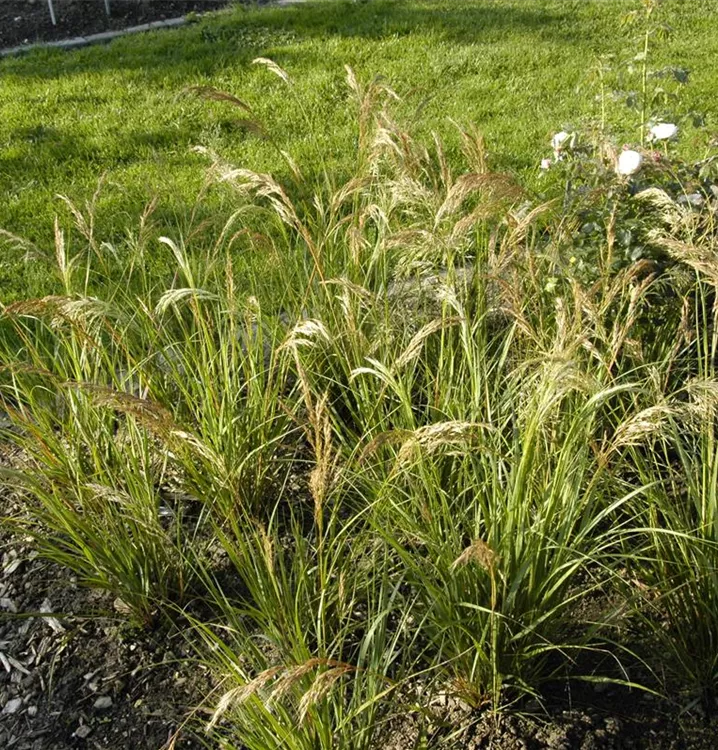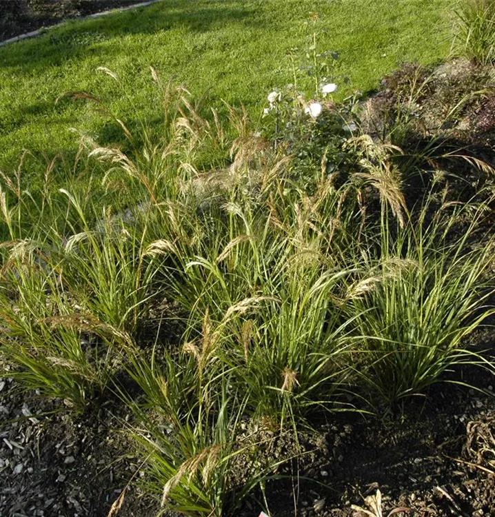 Das Silberährengras 'Algäu' (Stipa calamagrostis) ist mit seiner mittelgrünen Blattfärbung ein dekoratives Gestaltungselement im Garten, welches mit seinem horstbildenden und überhängenden Wuchs aber auch Kübel auf Balkon oder Terrasse ziert. Die cremeweißen Blütenrispen schmücken diese Gras ab Sommer. An einem sonnigen bis halbschattigen Standort fühlt es sich am wohlsten. Bei günstigen Bedingungen erreicht dieses winterharte Gras eine Höhe von ca. 80 cm und wird bis zu 70 cm breit.
