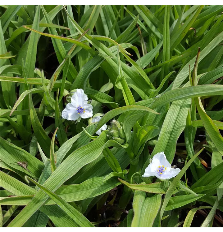 Tradescantia andersoniana 'Osprey' bildet schalenförmige, weiß-lilafarbene Blüten ab Juni.