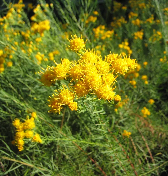 Die Goldhaar-Aster (Aster linosyris) ist eine aufrechte, lockere Staude, die von August bis September gelbe, röhrenförmige, in Dolden angeordnete Blüten mit einem angenehmen Duft bildet. An einem sonnigen Standort mit durchlässigem Boden erreicht sie gewöhnlich eine Höhe von ca. 60 cm und wird ca. 30 cm breit. Die Goldhaar-Aster ist gut frostverträglich.