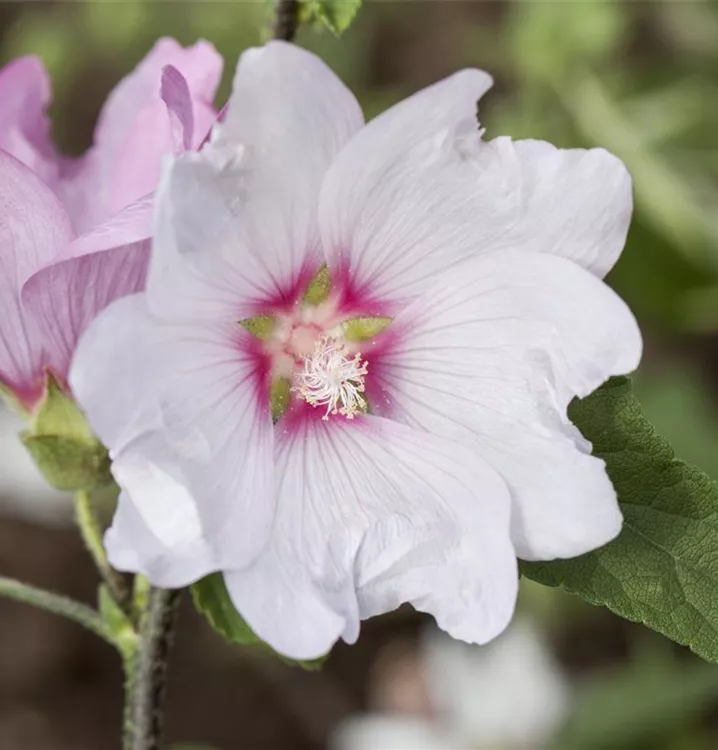 Lavatera x olbia 'Baby Barnsley' bildet schalenförmige, hellrosafarbene Blüten ab Juli. Diese werden etwa 5 - 10 cm groß.