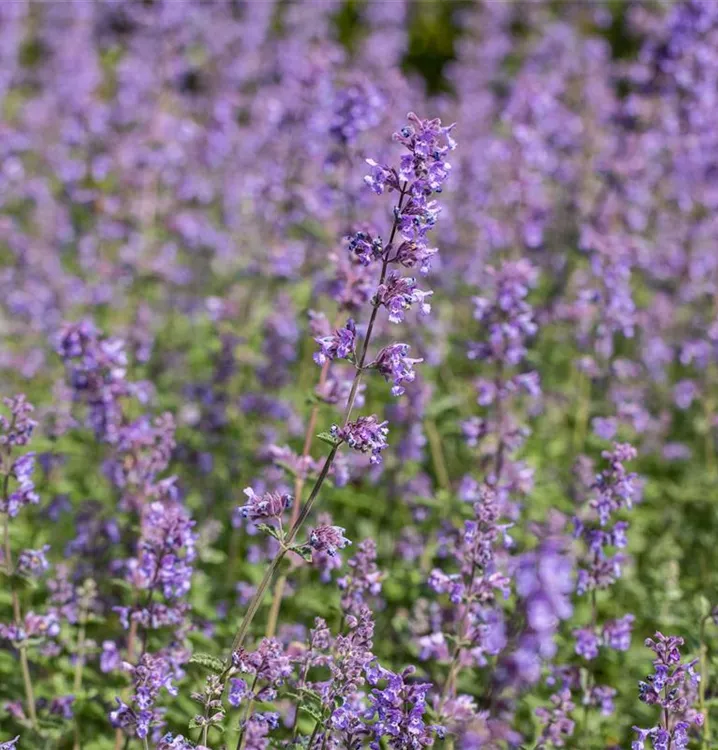 Die Katzenminze (Nepeta x faassenii) ist eine horstbildende, buschige Staude, die von Mai bis September blaue, lippenförmige Blüten bildet. An einem sonnigen Standort mit durchlässigem, sandigem Boden erreicht sie gewöhnlich eine Höhe von ca. 40 cm und wird ca. 30 cm breit. Die Katzenminze ist gut frostverträglich.