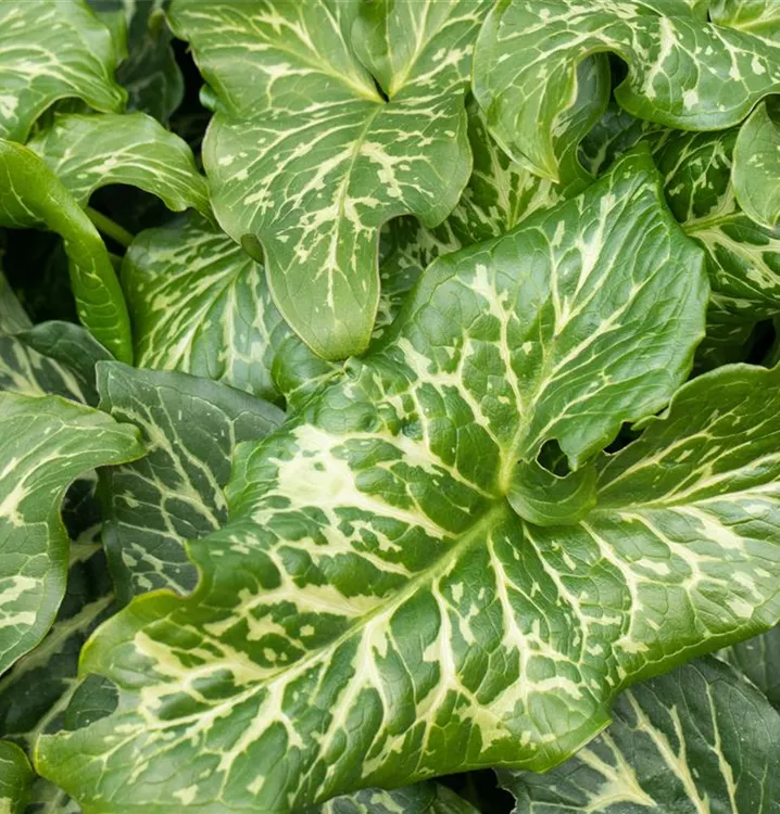 Hoher Blattschmuckwert. Die sommergrünen Blätter des Geaderten Garten-Aronstabs sind dunkelgrün, hellgrün geädert, pfeilförmig.