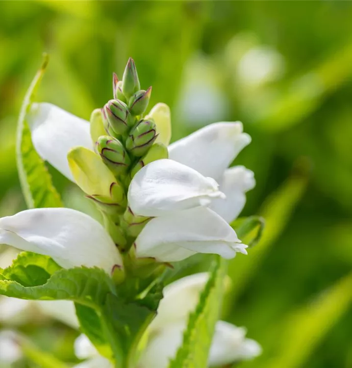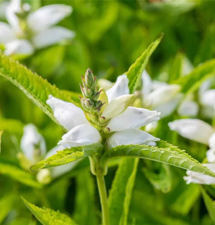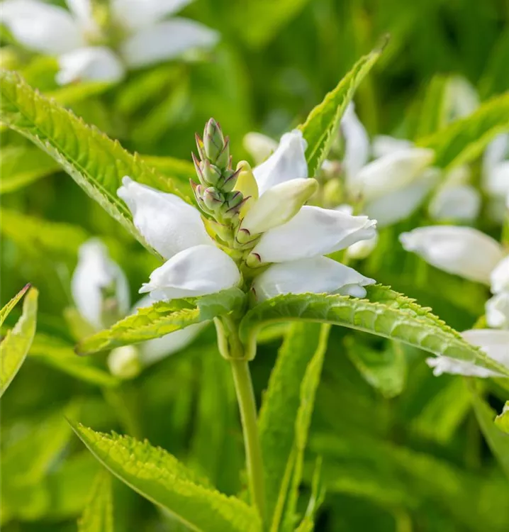 Der Garten-Schlangenkopf 'Alba' (Chelone obliqua) ist eine aufrechte Staude, die von August bis Oktober weiße, rachenförmige Blüten bildet. An einem sonnigen bis halbschattigen Standort mit durchlässigem Boden erreicht er gewöhnlich eine Höhe von ca. 80 cm und wird ca. 50 cm breit. Der Garten-Schlangenkopf 'Alba' ist gut frostverträglich.