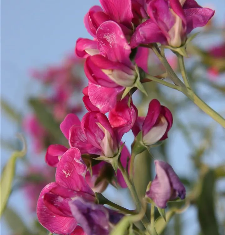 Lathyrus latifolius 'Rote Perle' bildet schmetterlingsförmige, rote Blüten ab Juli.