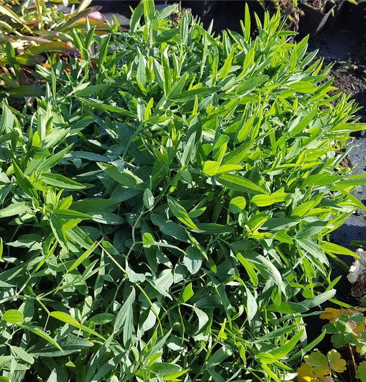 Die sommergrünen Blätter der Garten-Platterbse 'Weiße Perle' sind mittelgrün, gefiedert.
