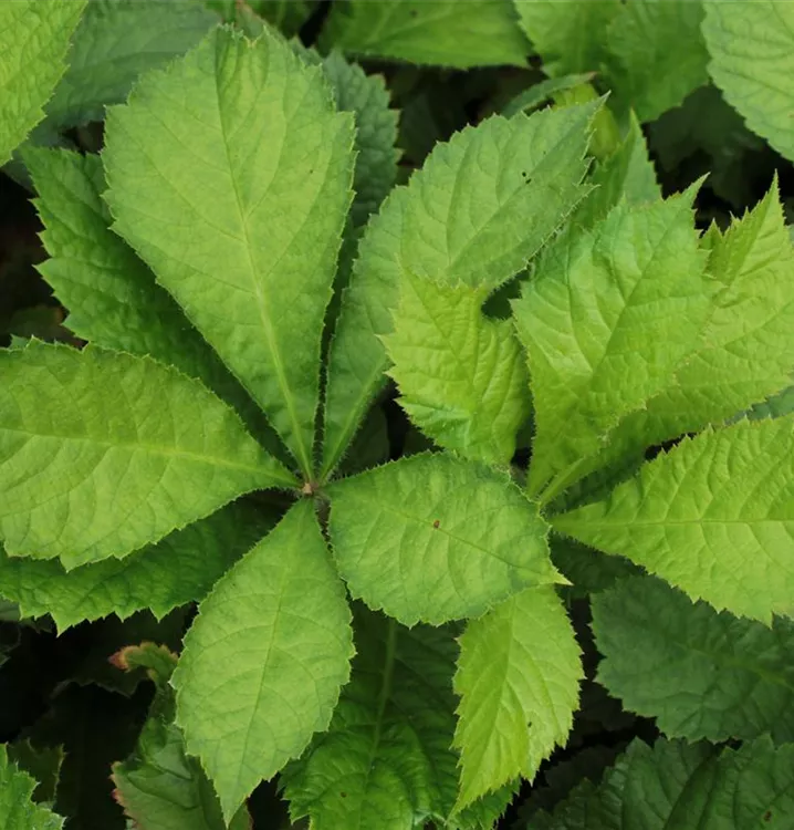 Hoher Blattschmuckwert. Die sommergrünen Blätter des Kastanienblättrigen Schaublatts sind mittelgrün, handförmig, gezähnt.