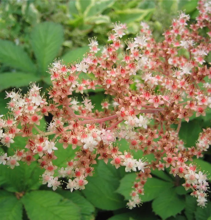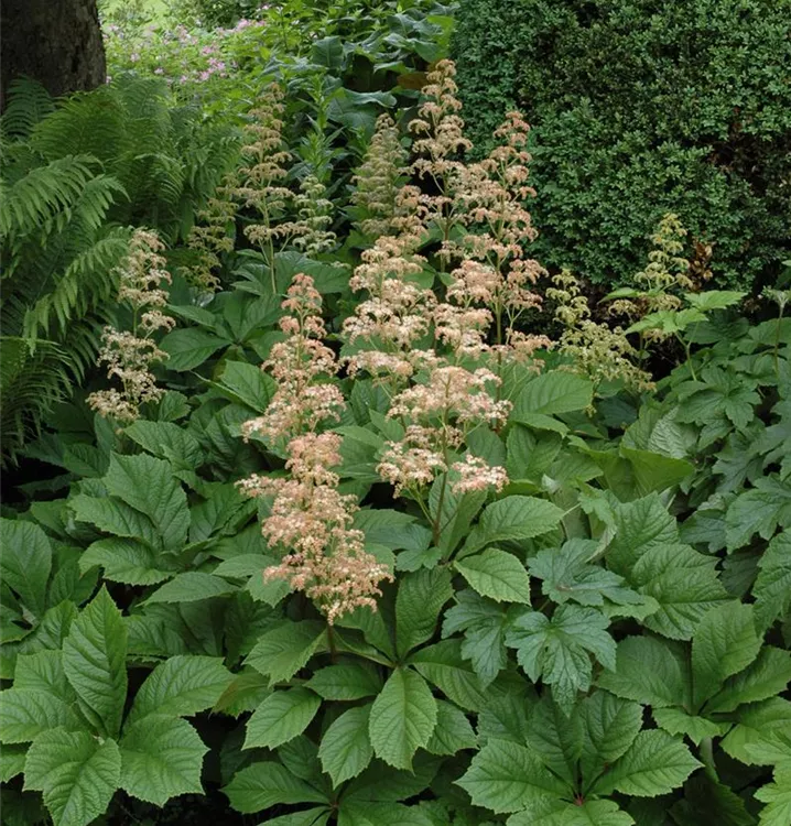 Rodgersia aesculifolia bildet in Rispen angeordnete, weiße Blüten ab Mai.
