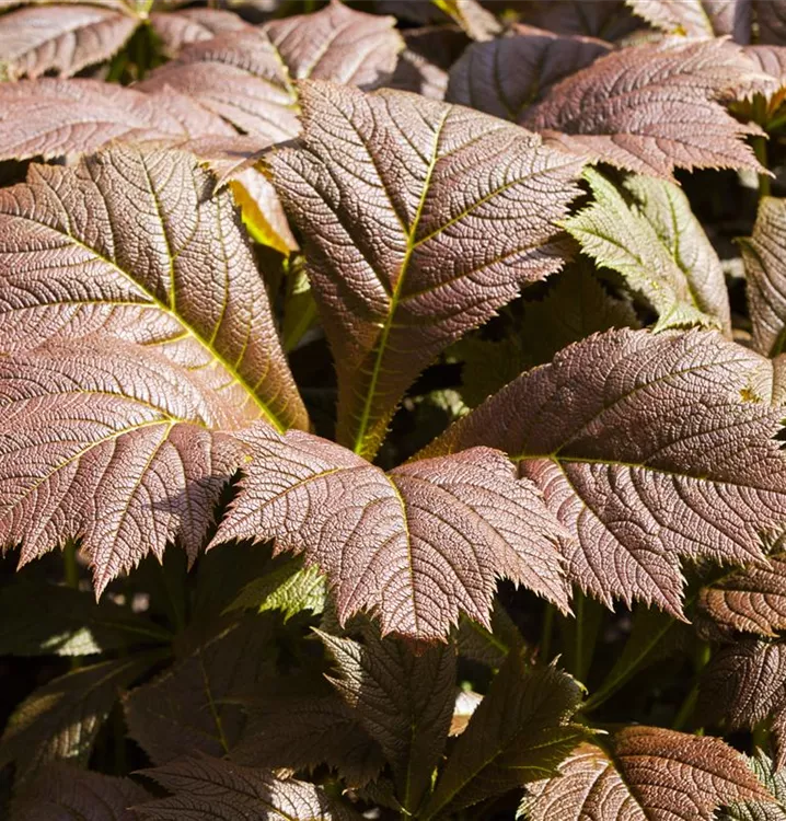 Das Garten-Schaublatt 'Rotlaub' (Rodgersia podophylla) ist eine aufrechte, horstbildende Staude mit dekorativen, handförmigen, dunkelroten Blättern. An einem halbschattigen bis schattigen Standort mit durchlässigem, humosem Boden erreicht es gewöhnlich eine Höhe von ca. 1 m und wird ca. 70 cm breit. Das Garten-Schaublatt 'Rotlaub' ist gut frostverträglich.