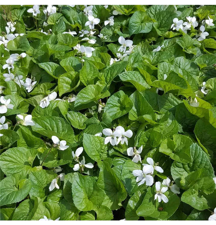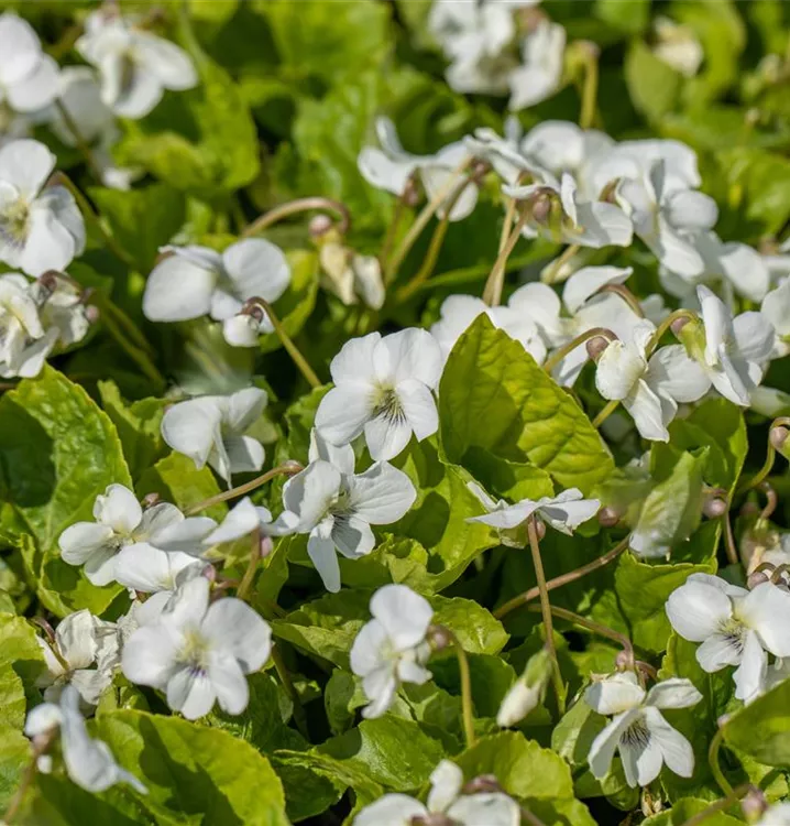 Viola sororia 'Albiflora' bildet lippenförmige, weiße Blüten ab Mai.