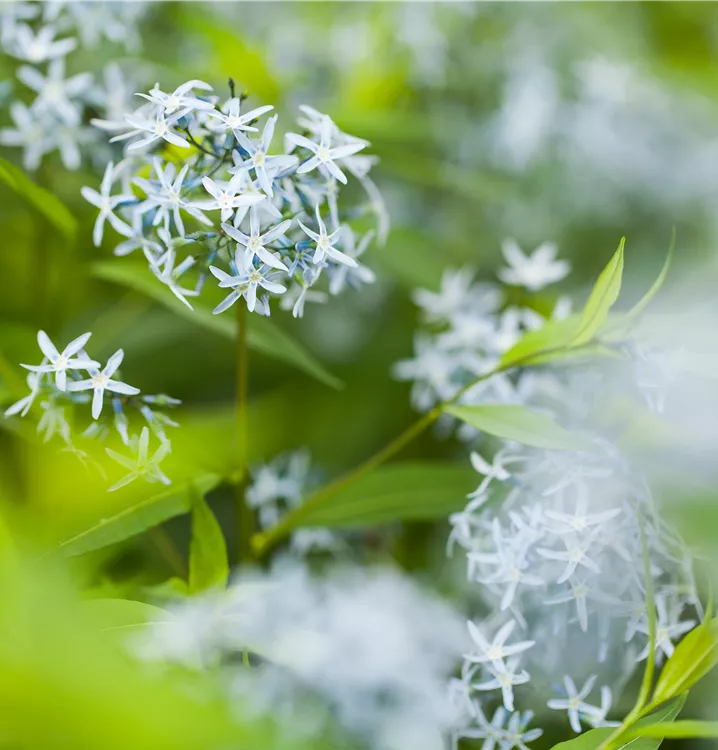 Amsonia orientalis 'Blue Ice' bildet sternförmige, in Dolden angeordnete, blaue Blüten ab Mai.
