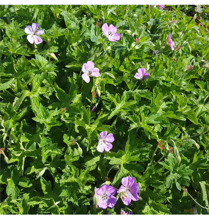 Der Garten-Storchschnabel 'Silvia´s Surprise'® (Geranium wallichianum) ist eine teppichartige Staude, die von Juni bis Oktober rosafarbene, weiße Blüten bildet. An einem sonnigen bis halbschattigen Standort erreicht er gewöhnlich eine Höhe von ca. 60 cm und wird ca. 60 cm breit. An den Boden stellt der Garten-Storchschnabel 'Silvia´s Surprise'® keine besonderen Ansprüche. Der Garten-Storchschnabel 'Silvia´s Surprise'® ist gut frostverträglich.