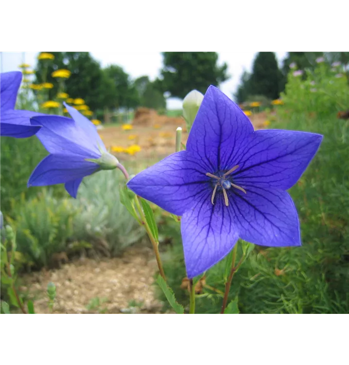 Die Großblütige Garten-Ballonblume 'Mariesii' (Platycodon grandiflorus) ist eine aufrechte Staude, die von Juli bis August blaue, glockenförmige Blüten bildet. An einem sonnigen bis halbschattigen Standort mit durchlässigem, nährstoffreichem Boden erreicht sie gewöhnlich eine Höhe von ca. 50 cm und wird ca. 40 cm breit. Die Großblütige Garten-Ballonblume 'Mariesii' ist gut frostverträglich.