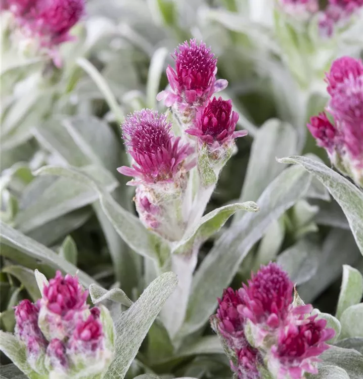 Antennaria dioica bildet ballförmige, rosafarbene Blüten ab Mai.