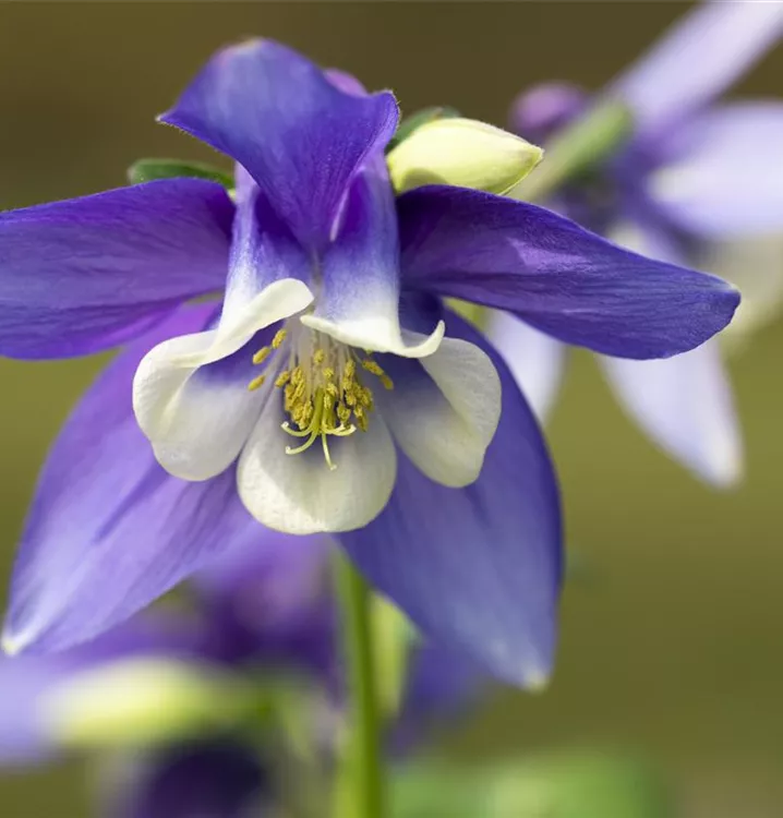 Aquilegia caerulea 'Blue Star' bildet glockenförmige, blau-weiße Blüten ab Mai. Diese werden etwa 7 - 8 cm groß.