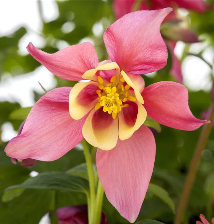 Die Akelei 'Koralle' (Aquilegia caerulea 'Koralle') bildet zweifarbige, ansehnliche Blüten von Mai bis Juni. Die bis zu 8 cm großen Blüten sind glockenförmig.