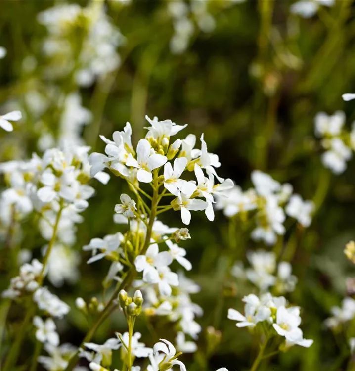 Arabis procurrens 'Glacier' bildet radförmige, in Trauben angeordnete, weiße Blüten ab April.