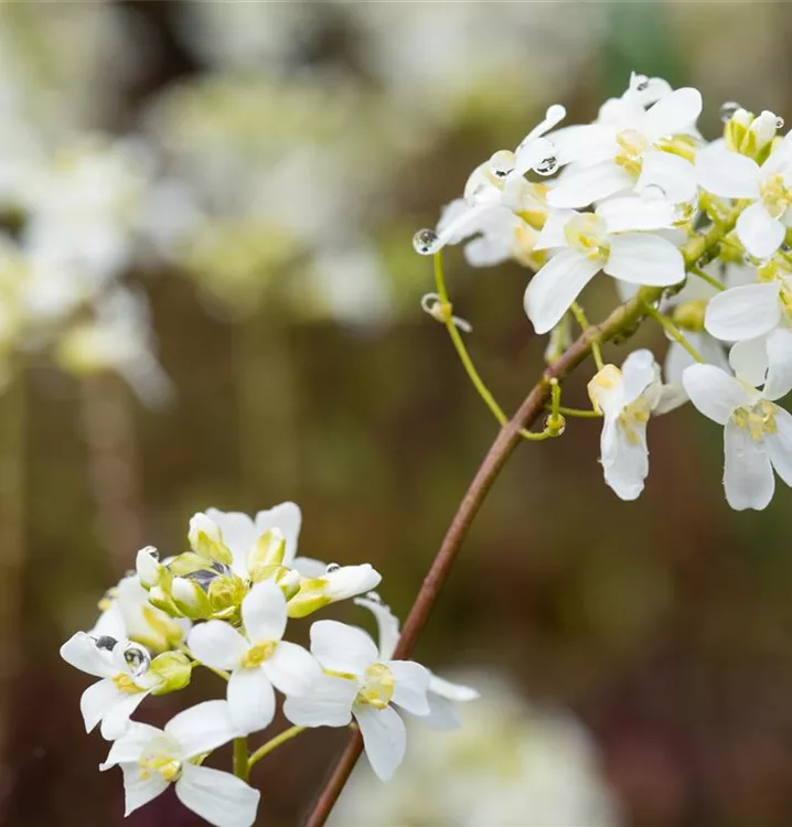 Arabis procurrens 'Neuschnee' bildet radförmige, in Trauben angeordnete, weiße Blüten ab April.