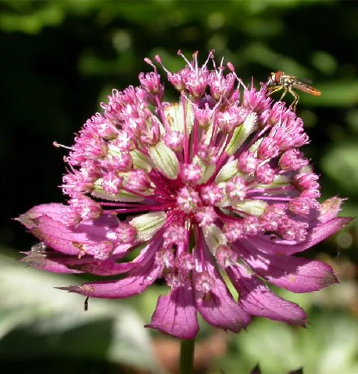 Die Garten-Sterndolde 'Claret' (Astrantia major) ist eine aufrechte Staude, die von Juli bis August dunkelrote, sternförmige, in Dolden angeordnete Blüten bildet. An einem halbschattigen Standort mit durchlässigem, humosem, nährstoffreichem Boden erreicht sie gewöhnlich eine Höhe von ca. 60 cm und wird ca. 50 cm breit. Die Garten-Sterndolde 'Claret' ist gut frostverträglich.