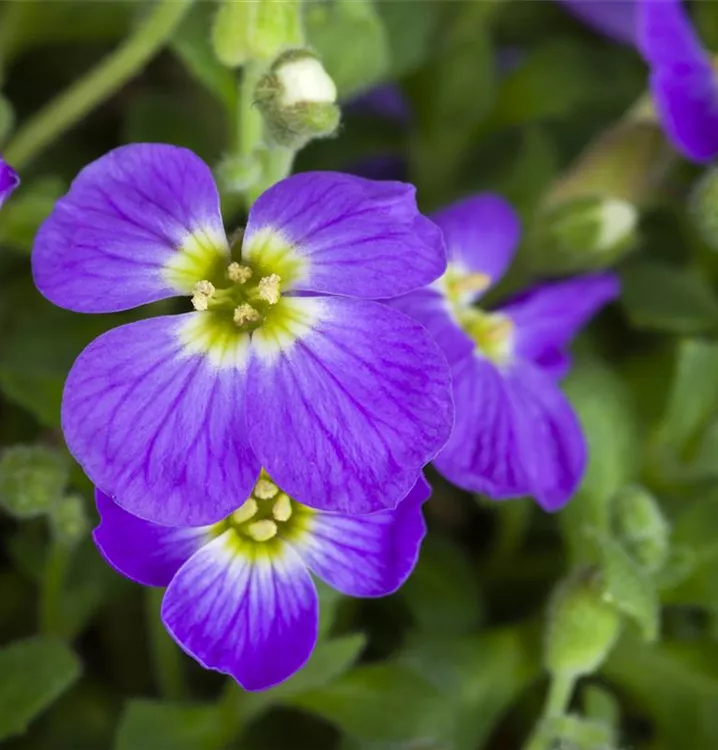 Aubrieta x cultorum 'Blaumeise' bildet radförmige, blauviolette Blüten ab April.