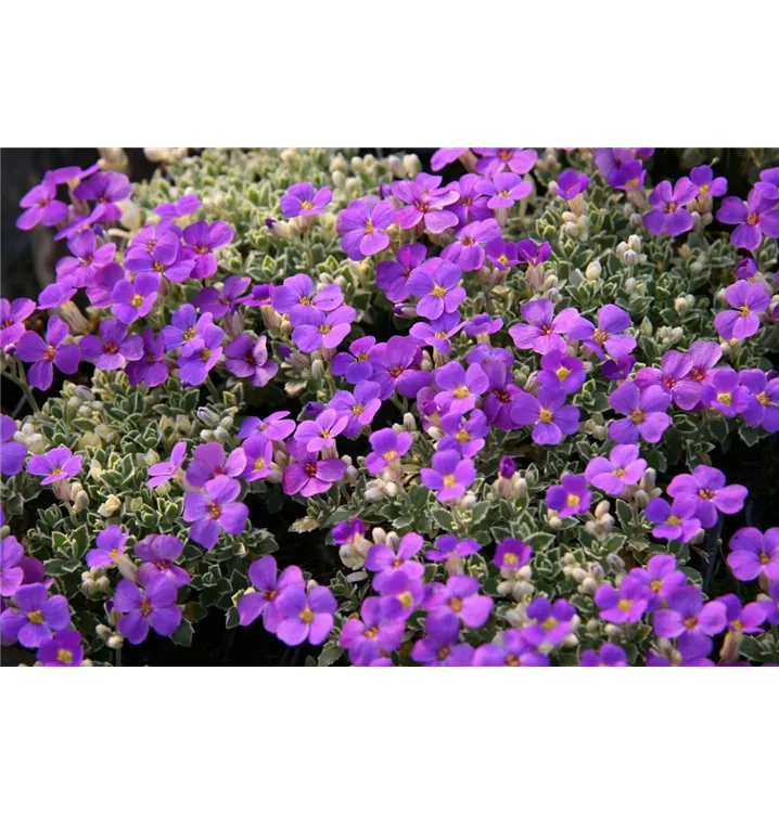 Aubrieta x cultorum 'Silberrand' bildet radförmige, blauviolette Blüten ab April.