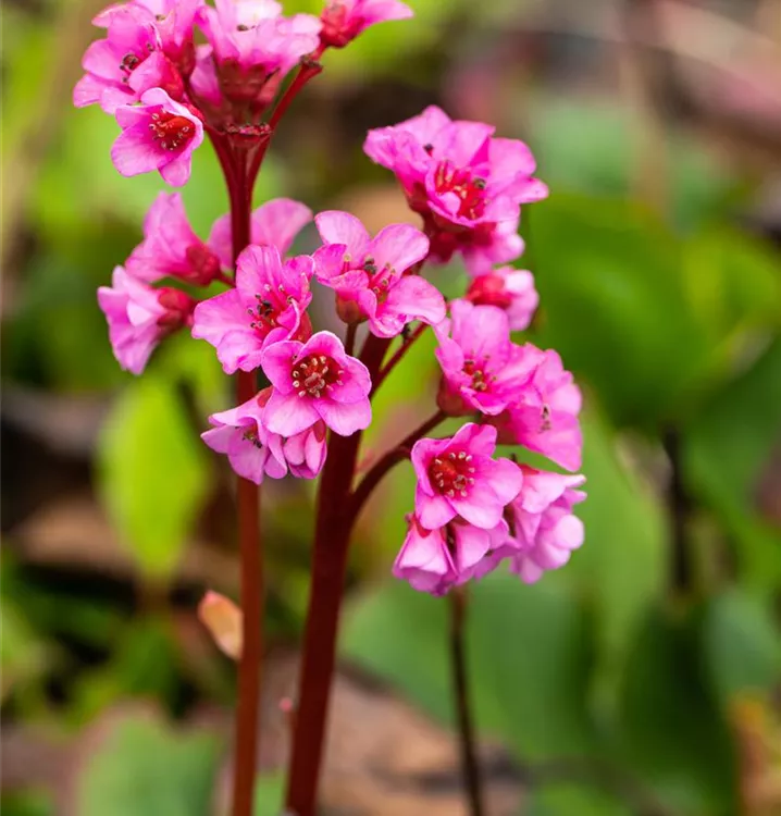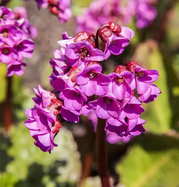 Bergenia cordifolia 'David' bildet glockenförmige, in Dolden angeordnete, dunkelrosafarbene Blüten ab März. Bei richtiger Pflege Nachblüte von November bis Dezember.
