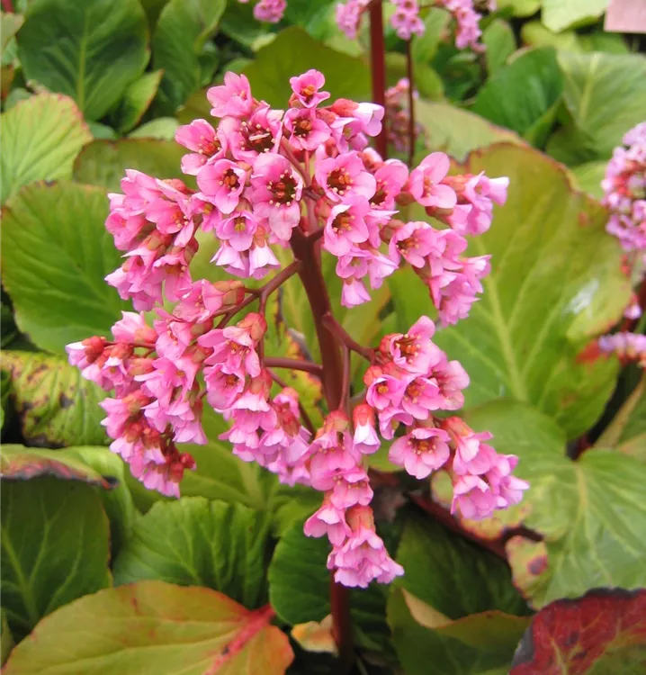 Bergenia cordifolia 'Herbstblüte' bildet in Dolden angeordnete, rosafarbene Blüten ab April. Bei richtiger Pflege Nachblüte von November bis Dezember.