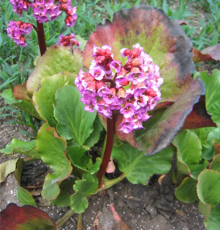 Bergenia cordifolia 'Morgenröte' bildet glockenförmige, in Dolden angeordnete, karminrote Blüten ab April. Bei richtiger Pflege Nachblüte im August.