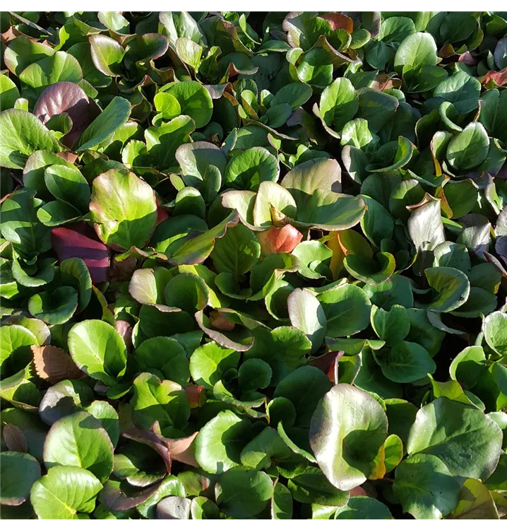 Hoher Blattschmuckwert. Die wintergrünen Blätter der Garten-Bergenie 'Rotblum' sind mittelgrün, eiförmig. Garten-Bergenie 'Rotblum' zeigt sich leuchtend rot im Herbst.