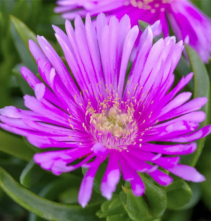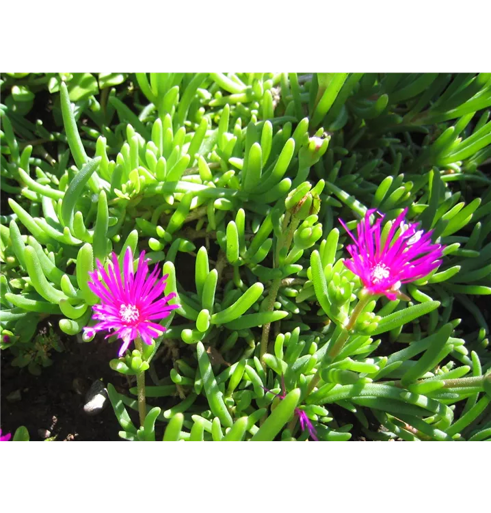 Delosperma cooperi bildet strahlenförmige, körbchenartige, rosafarbene Blüten ab Juni.