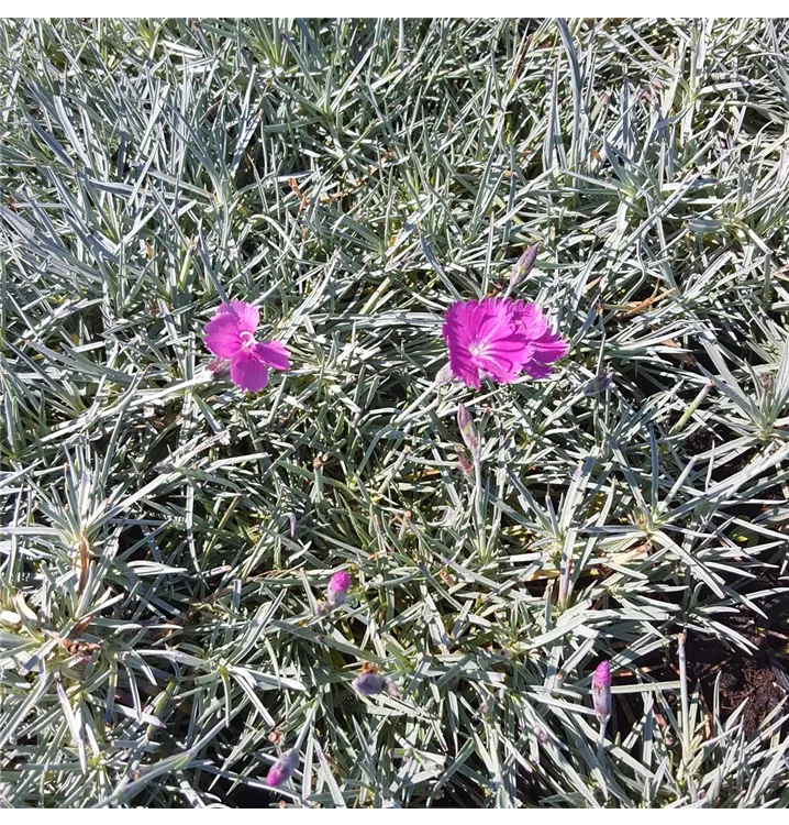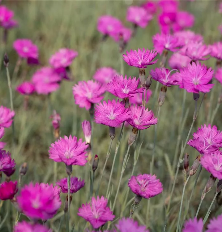 Dianthus gratianopolitanus 'Feuerhexe' bildet radförmige, karminrote Blüten ab Mai. Diese verströmen einen angenehmen Duft.