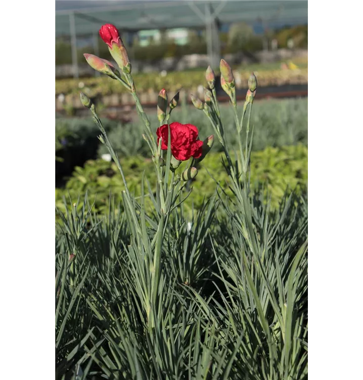 Die Garten-Feder-Nelke 'David' (Dianthus plumarius) ist eine dichte, teppichartige wintergrüne Staude, die von Juni bis Juli rote, radförmige, gefranste Blüten mit einem starken Duft bildet. An einem sonnigen Standort mit durchlässigem, kalkhaltigem, nährstoffreichem Boden erreicht sie gewöhnlich eine Höhe von ca. 30 cm und wird ca. 30 cm breit. Die Garten-Feder-Nelke 'David' ist gut frostverträglich.