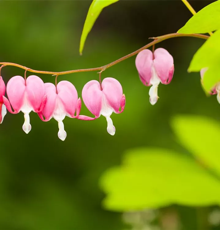 Dicentra spectabilis bildet in Trauben angeordnete, rosa-weiße Blüten ab Mai.