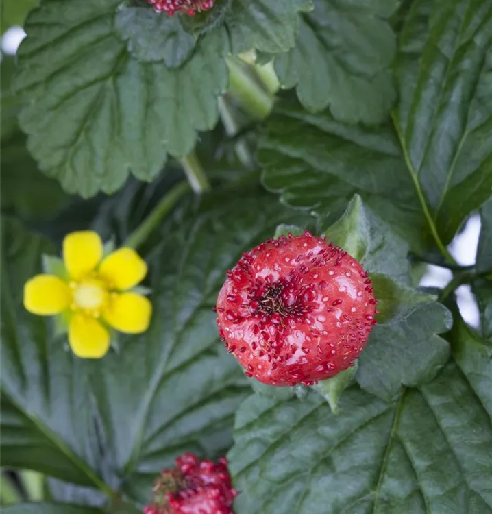 Besonders dekorativ sind die roten Früchte von Duchesnea indica. Diese erscheinen ab Juni.