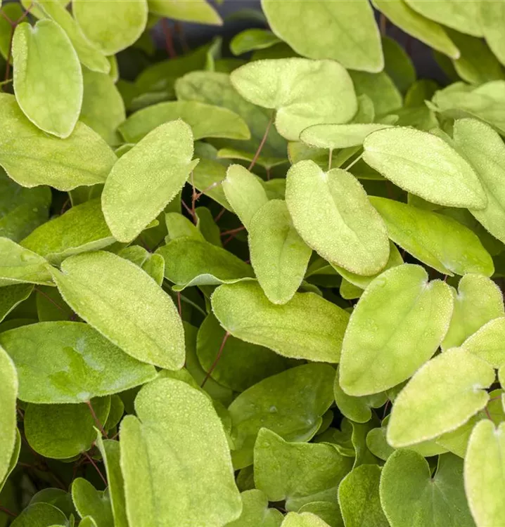Die wintergrünen Blätter der Garten-Elfenblume sind dunkelgrün, hellgrün geädert, herzförmig. Bronzefarbener Austrieb.
