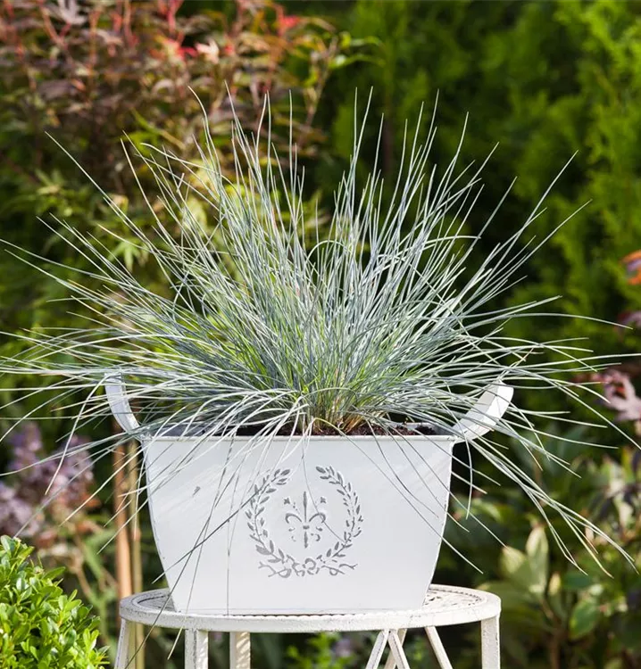 Der Blau-Schwingel 'Azurit' (Festuca cinerea) ist mit seiner blauen Blattfärbung ein dekoratives Gestaltungselement im Garten, welches sich an einem sonnigen Standort mit einem möglichst durchlässigen, sandigen, trockenen Boden am wohlsten fühlt. Die cremeweißen Blütenwedel schmücken die kompakt und polsterbildend wachsende Pflanze ab Sommer. Bei günstigen Bedingungen erreicht dieses winterharte Gras eine Höhe von ca. 25 cm und wird bis zu 30 cm breit.