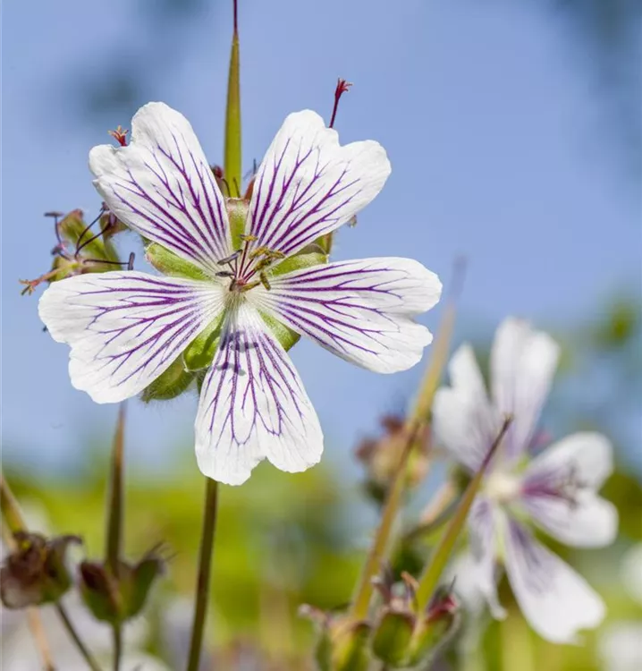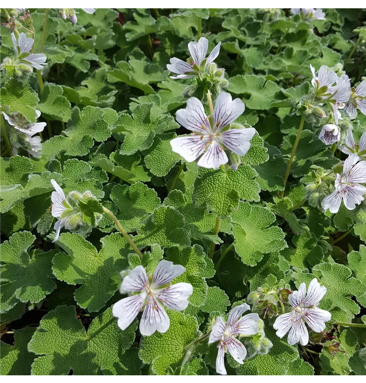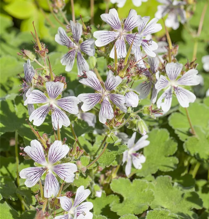 Geranium renardii bildet schalenförmige, weiß-lilafarbene Blüten ab Juni.