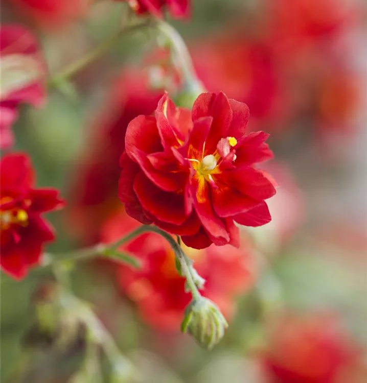 Helianthemum 'Rubin' bildet gefüllte, schalenförmige, blutrote Blüten ab Mai.