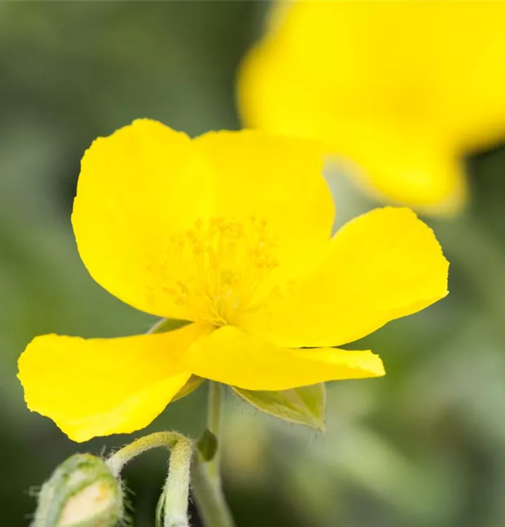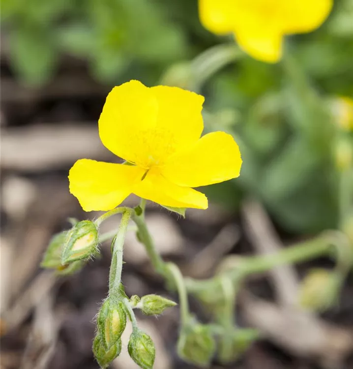 Helianthemum nummularium 'Sterntaler' bildet schalenförmige, goldgelbe Blüten ab Mai.