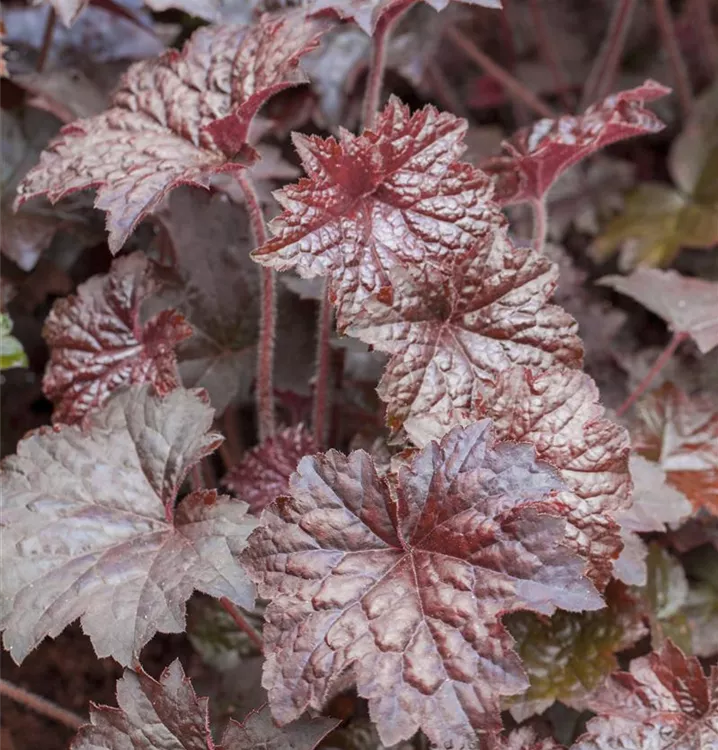 Hoher Blattschmuckwert. Die wintergrünen Blätter des Garten-Silberglöckchens 'Black Beauty'® sind dunkelrot, rundlich, gekerbt.