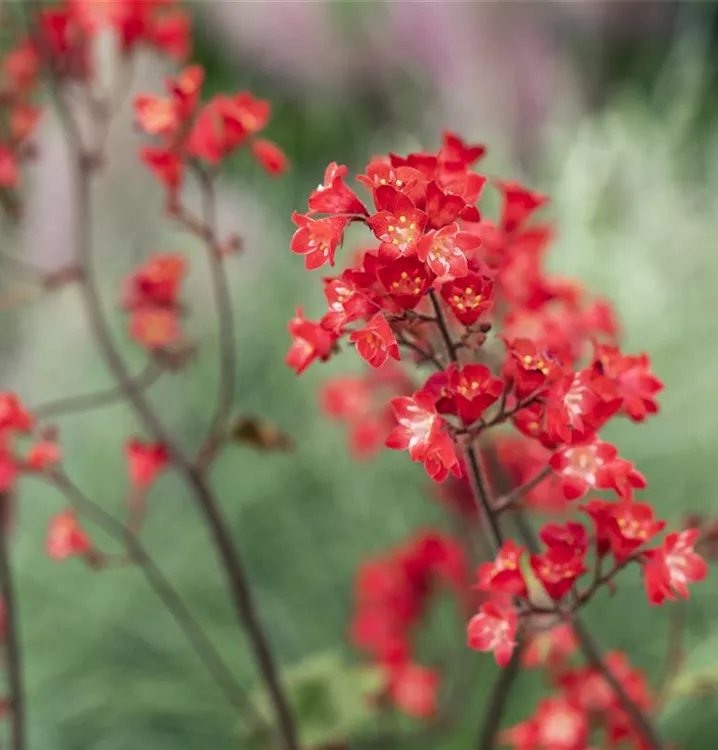 Heuchera sanguinea 'Leuchtkäfer' bildet in Rispen angeordnete, scharlachrote Blüten ab Juni.