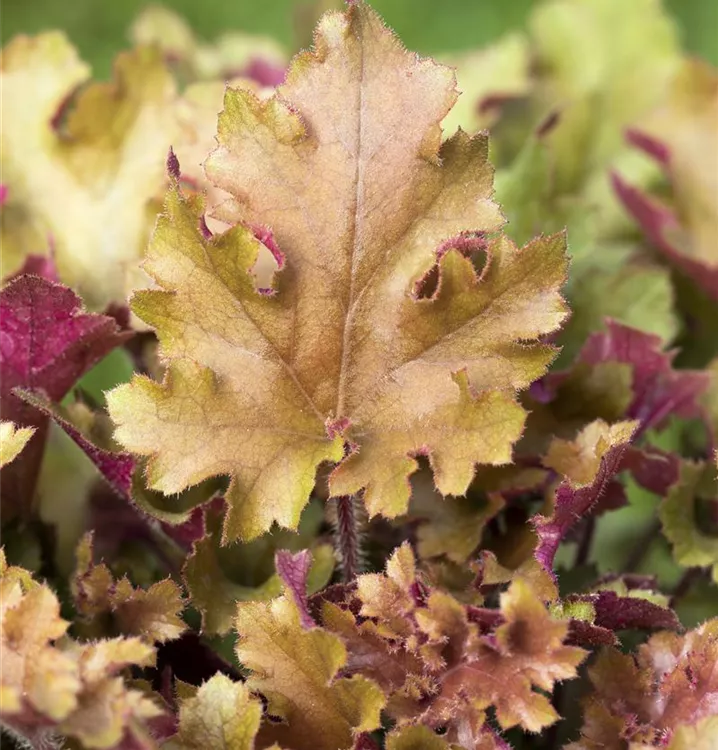 Das Purpurglöckchen (Heuchera) ist eine buschige wintergrüne Staude mit dekorativen, kupferbraunen Blättern. An einem sonnigen bis halbschattigen Standort mit durchlässigem, nährstoffreichem Boden erreicht es gewöhnlich eine Höhe von ca. 50 cm und wird ca. 40 cm breit. Das Purpurglöckchen ist gut frostverträglich.
