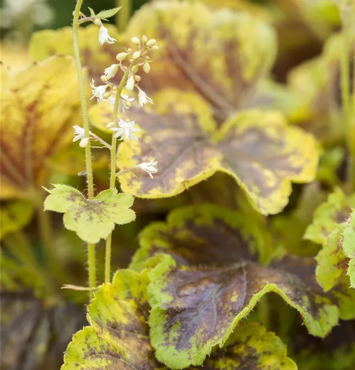 Heucherella alba 'Solar Eclipse'® bildet weiße Blüten ab Mai.