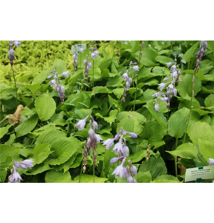 Die Glocken-Funkie (Hosta ventricosa) ist eine horstbildende, aufrechte, ausladend wachsende Staude mit dekorativen, herzförmigen, dunkelgrünen Blättern. An einem halbschattigen bis schattigen Standort mit durchlässigem, humosem Boden erreicht sie gewöhnlich eine Höhe von ca. 60 cm und wird ca. 60 cm breit. Die Glocken-Funkie ist gut frostverträglich.