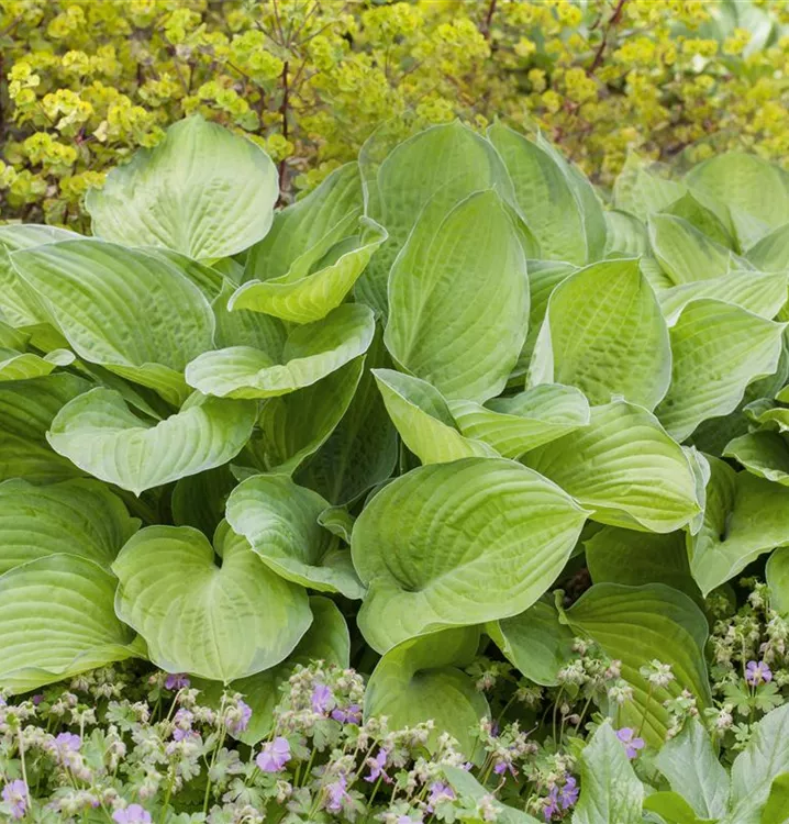 Die Großblättrige Garten-Funkie 'Sum and Substance' (Hosta) ist eine horstbildende, buschige, breite Staude mit dekorativen, herzförmigen, hellgrünen Blättern. An einem halbschattigen bis schattigen Standort mit durchlässigem, humosem Boden erreicht sie gewöhnlich eine Höhe von ca. 80 cm und wird ca. 70 cm breit. Die Großblättrige Garten-Funkie 'Sum and Substance' ist gut frostverträglich.