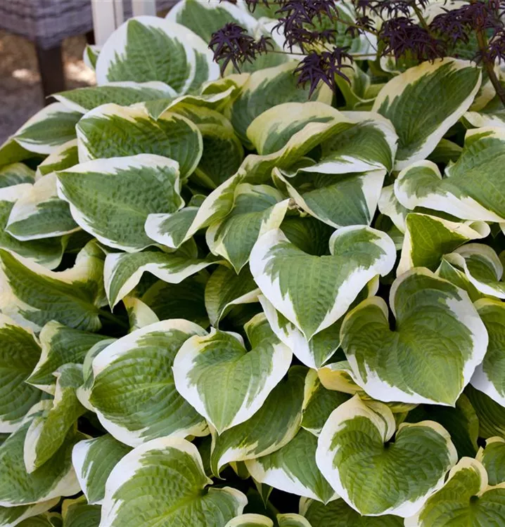 Unter Gehölzen ergibt sich häufig eine freie Fläche. Die muss nicht langweilig bleiben. Ein schöner Blattschmuck ist eine gute Lösung, wie der pfiffige Gärtner weiß. Die Weißrandige Garten-Funkie 'Wide Brim' macht sich in diesen schattigen Gartenbereichen ganz hervorragend. Ihr gelb-grünes Laub wächst wunderschön buschig und breit. Die Höhe von ca. einem halben Meter ist genau die Abmessung, die vor den Gehölzpflanzen gefragt ist.