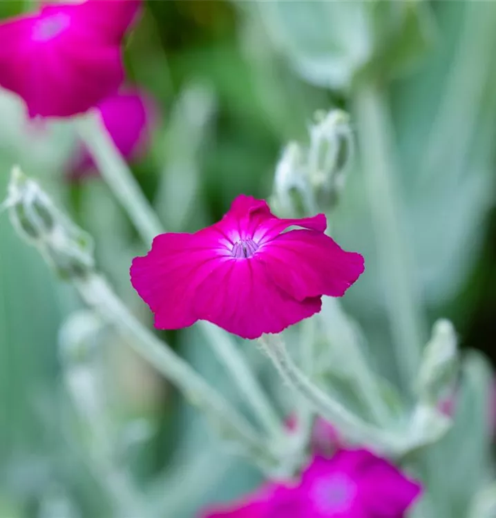 Lychnis coronaria bildet radförmige, karminrote Blüten ab Juli.